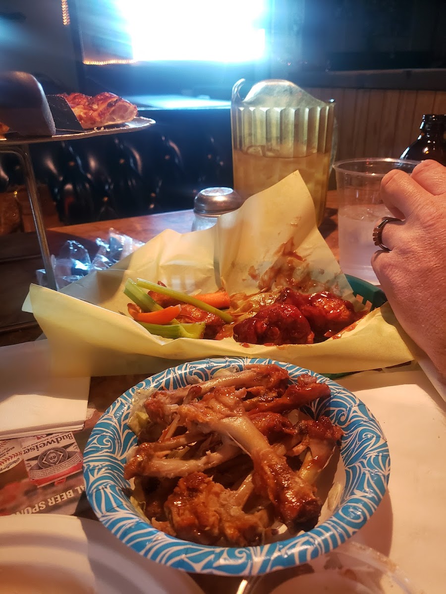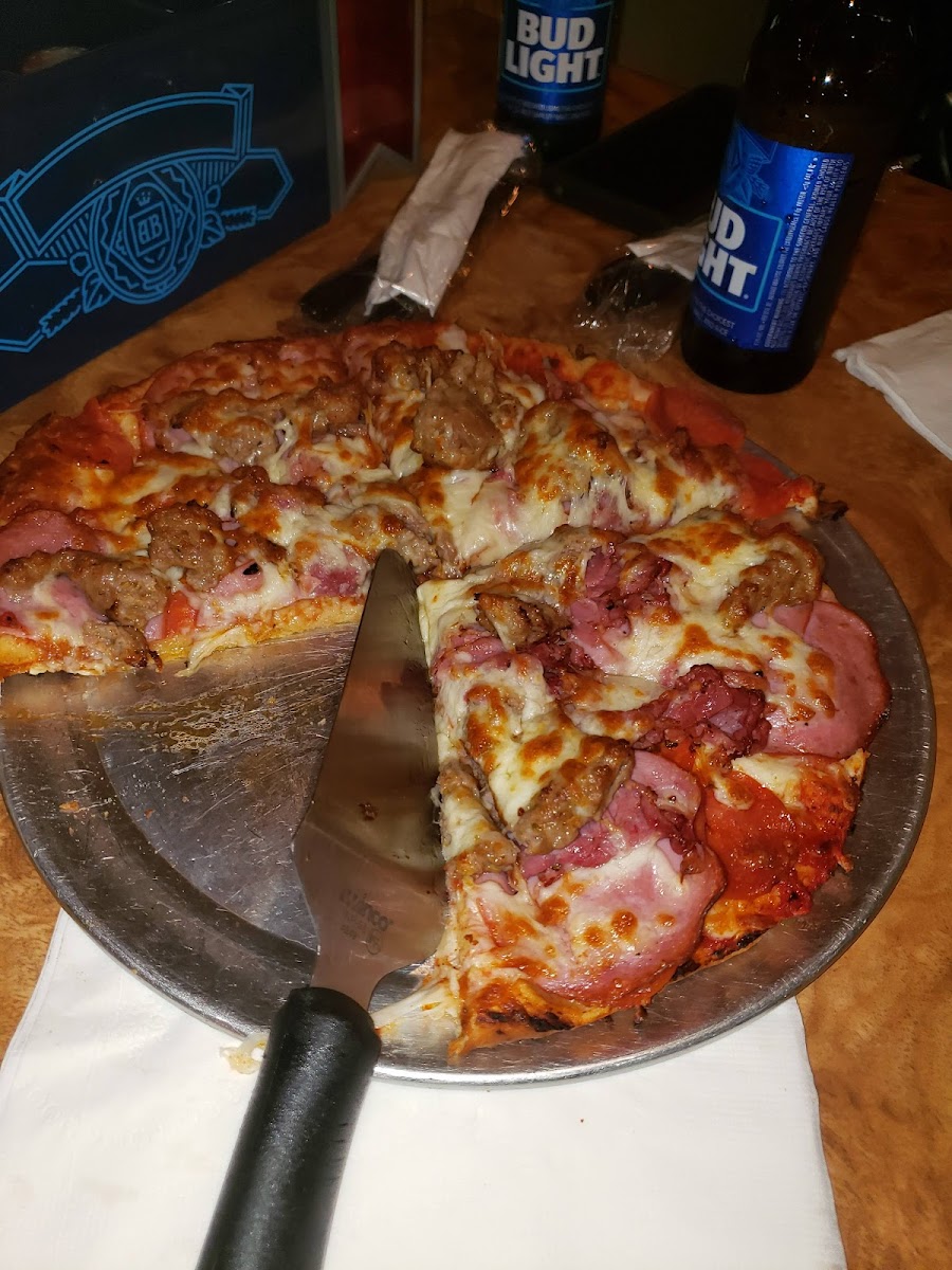 Pizza was pretty great. Toppings were fresh tasting, crust was thick and fluffy, and plenty of cheese. Dive bar atmosphere, rough around the edges, but if that’s what you’re into it’s great. Wings were tasty too, but a bit pricey.